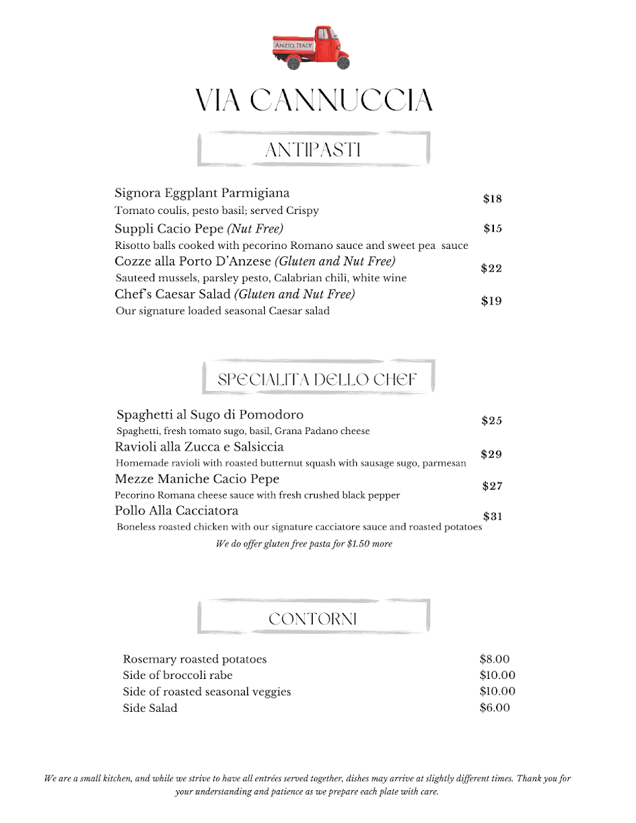 Welcome to Via Cannuccia, a charming Italian eatery nestled in 1739 Dorchester Ave, Boston. With its cozy ambiance and dedicated staff, this restaurant offers a genuine taste of Italy to food enthusiasts. The menu showcases delightful dishes, spearheaded by the chef's specialities. Must-try items include Spaghetti al Sugo di Pomodoro, a classic adorned with fresh tomato sugo and basil, and the rich Ravioli alla Zucca e Salsiccia, featuring homemade pasta filled with roasted butternut squash and savory sausage. For a uniquely flavorful experience, the Mezze Maniche Cacio Pepe delivers a creamy pecorino cheese sauce enhanced with black pepper.